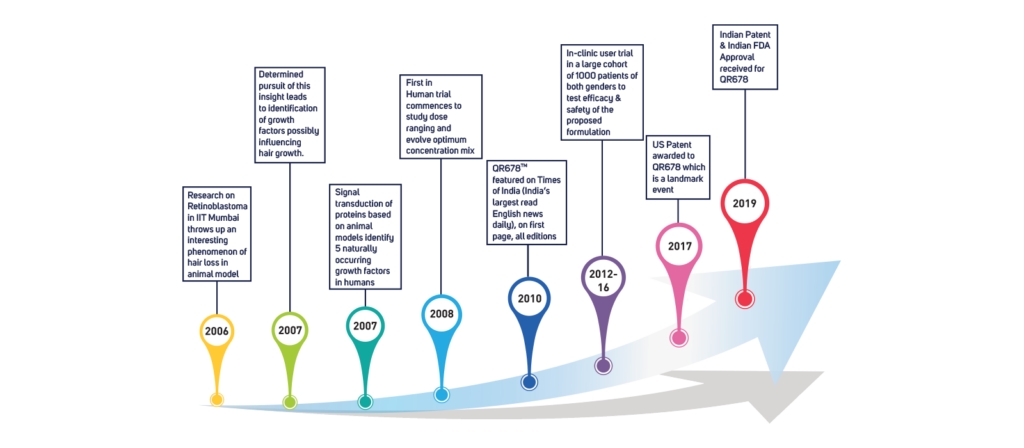 The QR678® Neo therapy is a proprietary, first in class hair fall & hair regrowth therapy, which has revolutionized the treatment of hair fall in alopecia. This formulation was invented in India & has been named QR678 inspired by the new generation ubiquitous presence of “Quick Response“ QR code. 678 in Morse Code signifies “there is no answer”. This formulation has been named QR678® to signify a “Quick Response to a disease which earlier had no answer”.
